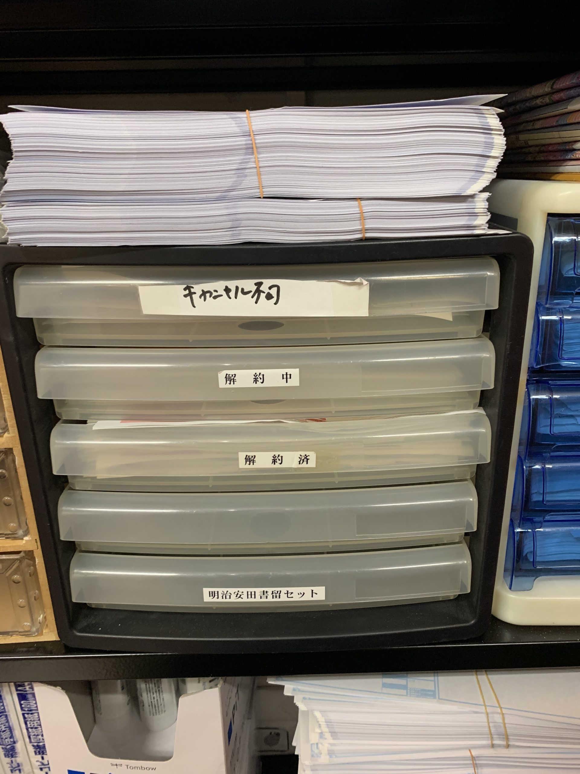 お客様に、教材が返送されていますがどのようにいたしましょうか…といった内容をメールで連絡して、教材が入っていた箱の中に受講証を戻す。もしくは、下記の場所にキャンセルの受講証をストックしているので、「キャンセル希望か分からず連絡待ち」というクリアホルダーに入れておく。