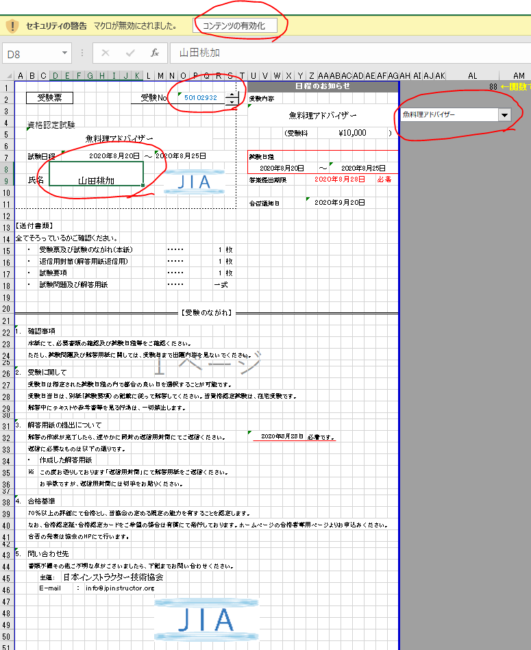 Excelを開いて、コンテンツを有効化する。そして、受験Noを▲を押して、1増やす。受験内容から、試験名を選択し、氏名の個所も変更して、印刷する。