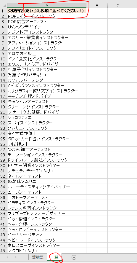 もし、試験名の中に無いものがあれば、自分で試験名をExcelの一覧のタブへ追加する。必ず、あいうえお順で追加すること!
