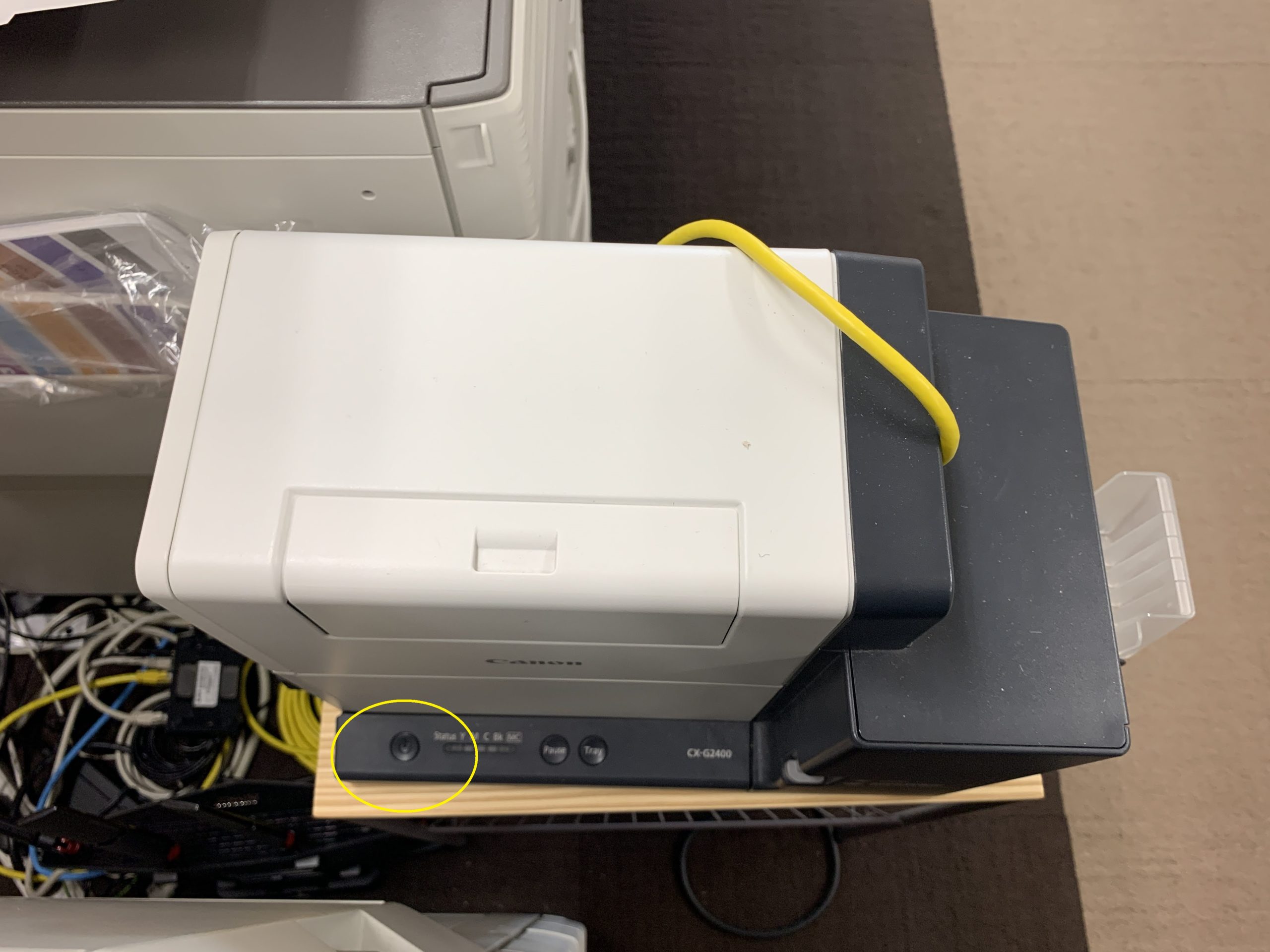 上記のデータを編集したら、次は印刷を行う。下記のプリンターの電源を入れる。電源は黄色の箇所にある。