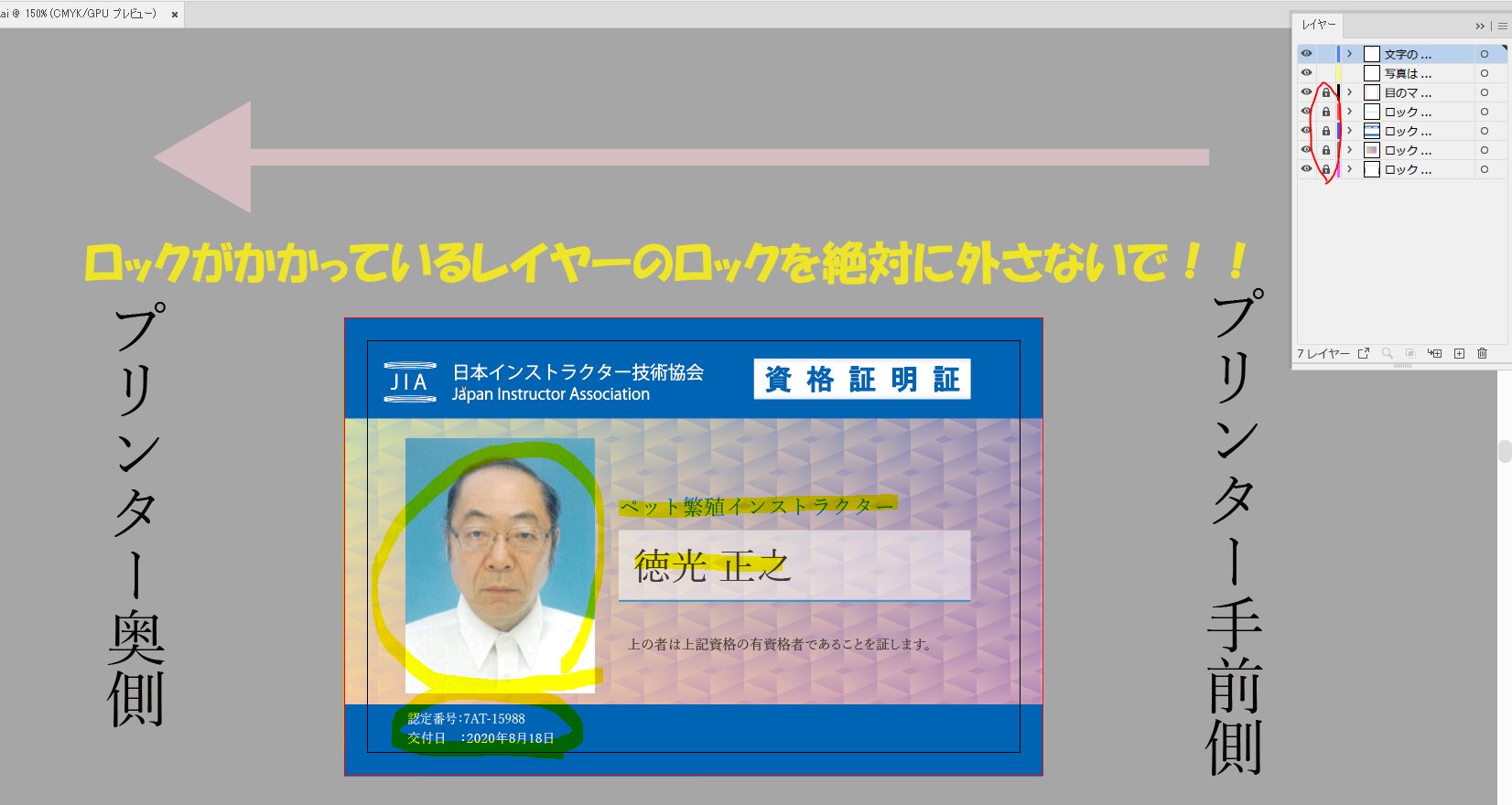 「名前」、「資格名」、「顔写真」、「交付日」を変更し、「認定番号」を発行するたびに1ずつ増やしていく。